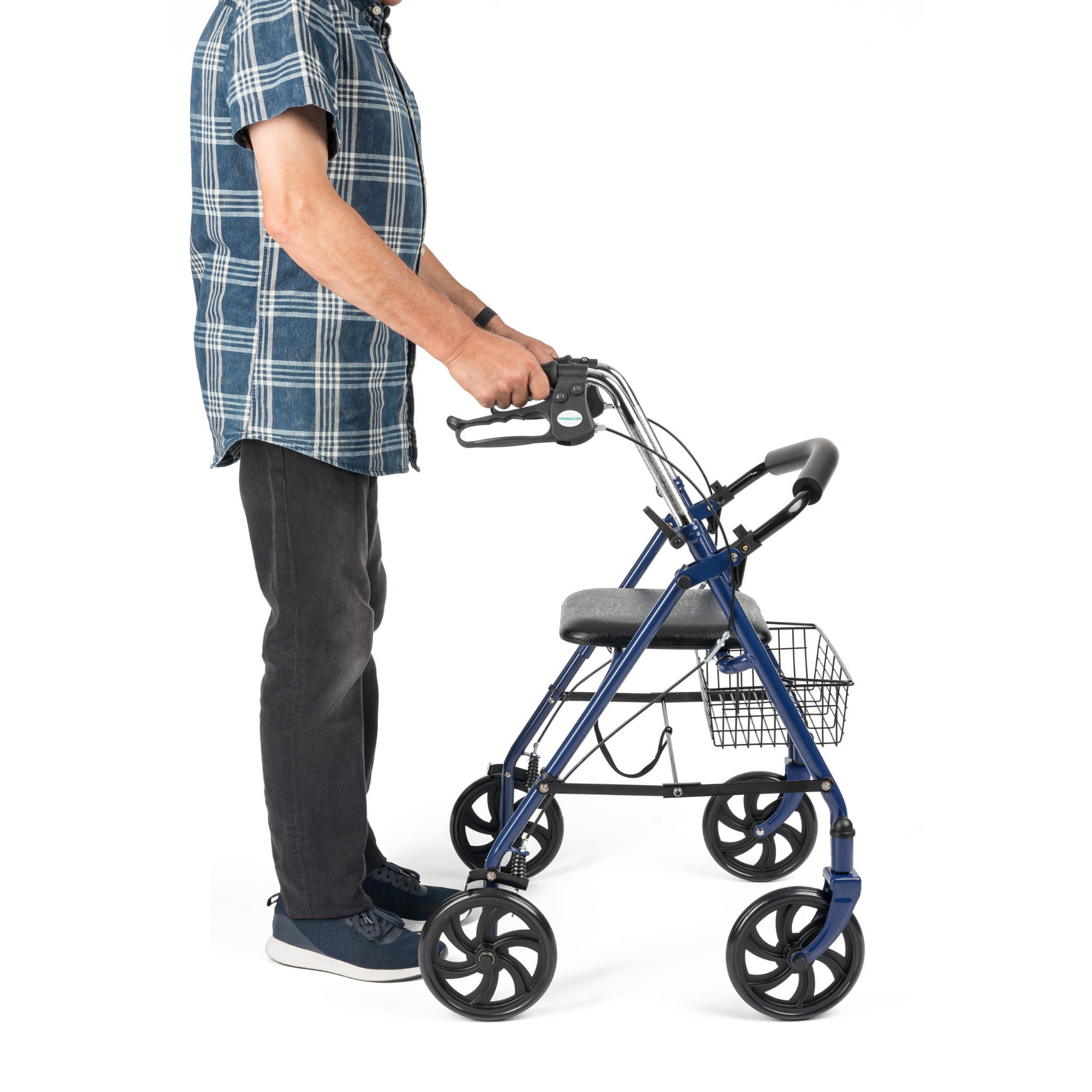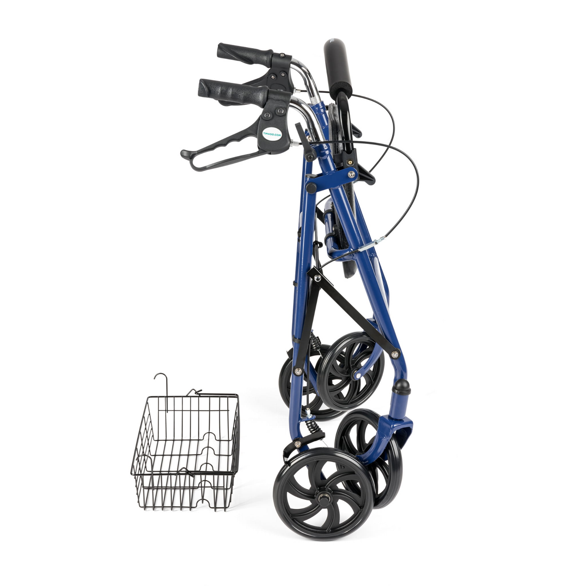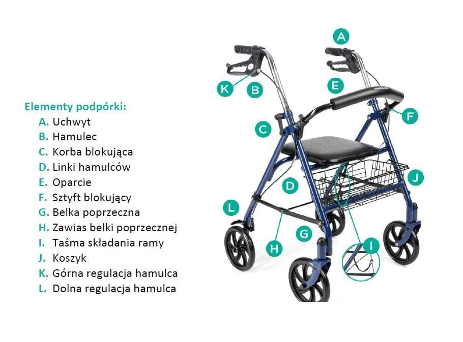 Podpórka czterokołowa, składana wykonana jest z ramy stalowej malowanej proszkowo. Posiada tapicerowane siedzisko, miękkie oparcie i zdejmowany koszyk. Wyposażona w regulowane na wysokość rączki zakończone anatomicznymi uchwytami oraz hamulce z zaciskiem postojowym. Posiada koła o wąskim przekroju i średnicy 8’’.