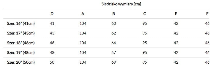 - Szerokość siedziska: 41cm, 43cm, 46cm, 48cm, 50cm