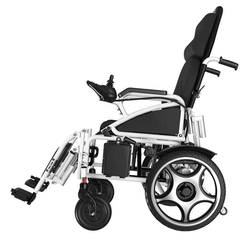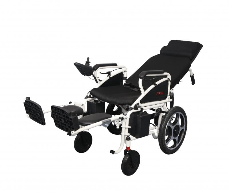 Wózek elektryczny z rozkładanym oparciem i podnoszonymi podnóżkami - funkcja leżenia.
