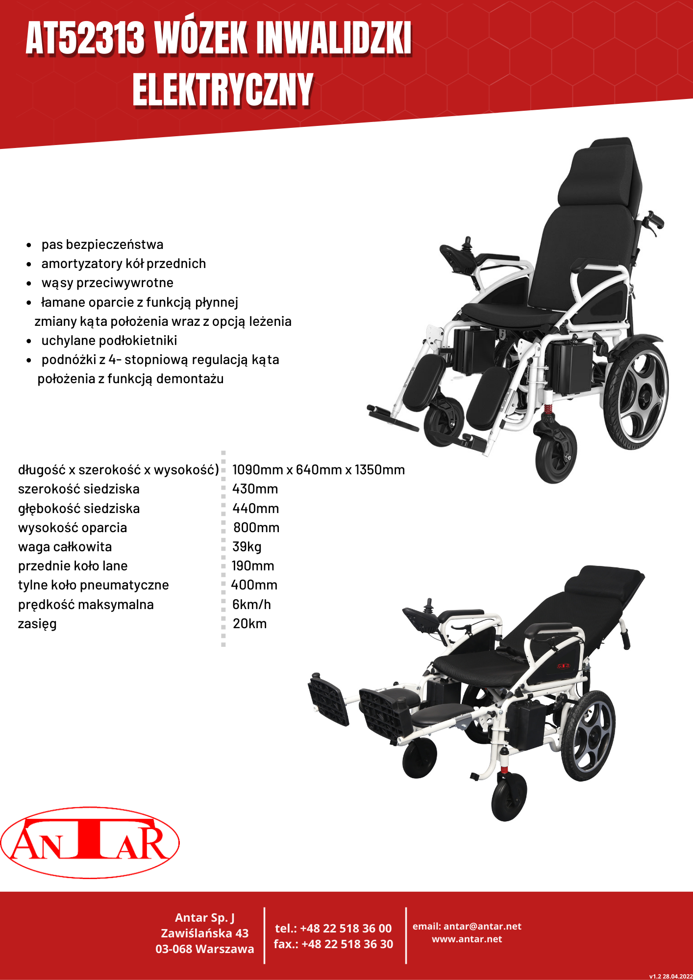 Wózek inwalidzki elektryczny z funkcją płynnej zmiany kąta położenia oparcia AT52313