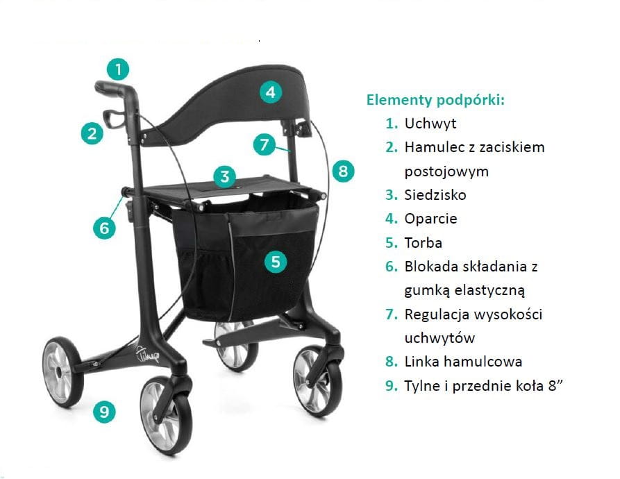 Posiada duże koła o średnicy 8’’, regulowane na wysokość rączki zakończone anatomicznymi uchwytami, tylne hamulce z zaciskiem postojowym, siedzisko z oparciem, pojemną torbę oraz uchwyt na laskę.