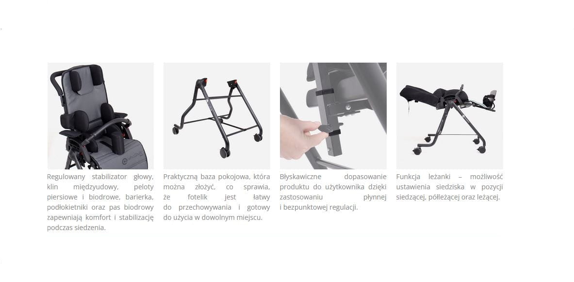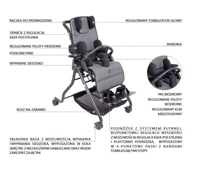 To zaawansowany fotelik rehabilitacyjny, stworzony specjalnie dla dzieci z dysfunkcjami narządów ruchu.