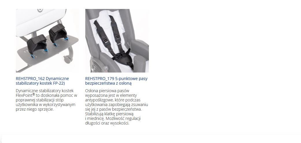 - Podnóżek z systemem płynnej, bezpunktowej regulacji wysokości z możliwością regulacji kąta pochylenia platformy podnóżka, wyposażony w 4-punktowe paski z bandami stabilizującymi stopy
