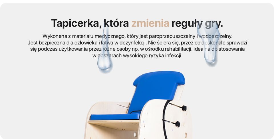 Tapicerka medyczna MEDICUS™ zastosowana w foteliku, jest paroprzepuszczalna, wodoszczelna oraz łatwa w dezynfekcji.