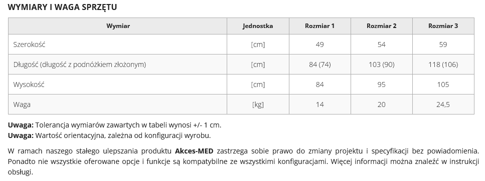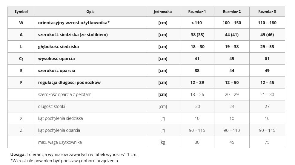 Tolerancja wymiarów zawartych w tabeli wynosi +/- 1 cm. *Wzrost nie powinien być podstawą doboru urządzenia.
