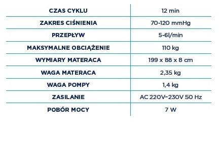 - Materac pneumatyczny, zmiennociśnieniowy o konstrukcji bąbelkowej; - 130 komór (bąbelków) w układzie dwóch sekcji komór na przemian wypełnianych powietrzem