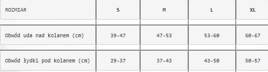 Aby dobrać odpowiedni rozmiar należy zmierzyć obwód uda nad kolanem oraz obwód łydki pod kolanem.