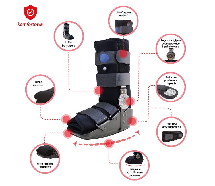 - Dzięki lekkiej konstrukcji nie obciąża kończyny, a zastosowana miękka wyściółka pneumatyczna gwarantuje wysoki komfort użytkowania.
