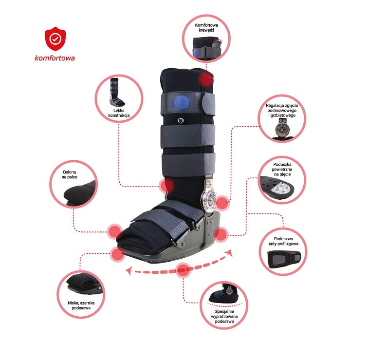 Stanowi doskonałą alternatywę do tradycyjnego unieruchomienia gipsowego, zdecydowanie poprawiając komfort użytkowania.