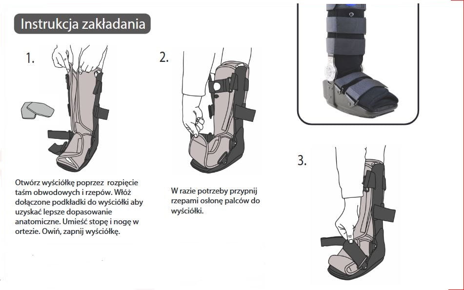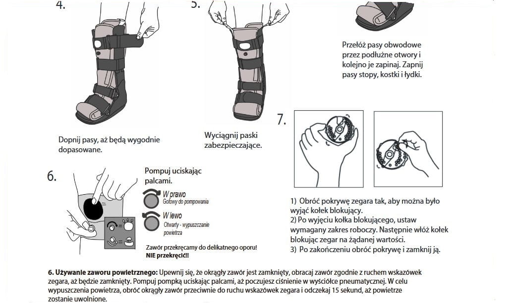 - Wyrób musi być prawidłowo założony tzn. wszystkie pasy obwodowe solidnie dopięte, komory powietrzne prawidłowo napompowane ab y gwarantować prawidłową stabilizację kończyny - użytkowanie rozpiętej ortezy grozi wypadkiem!.