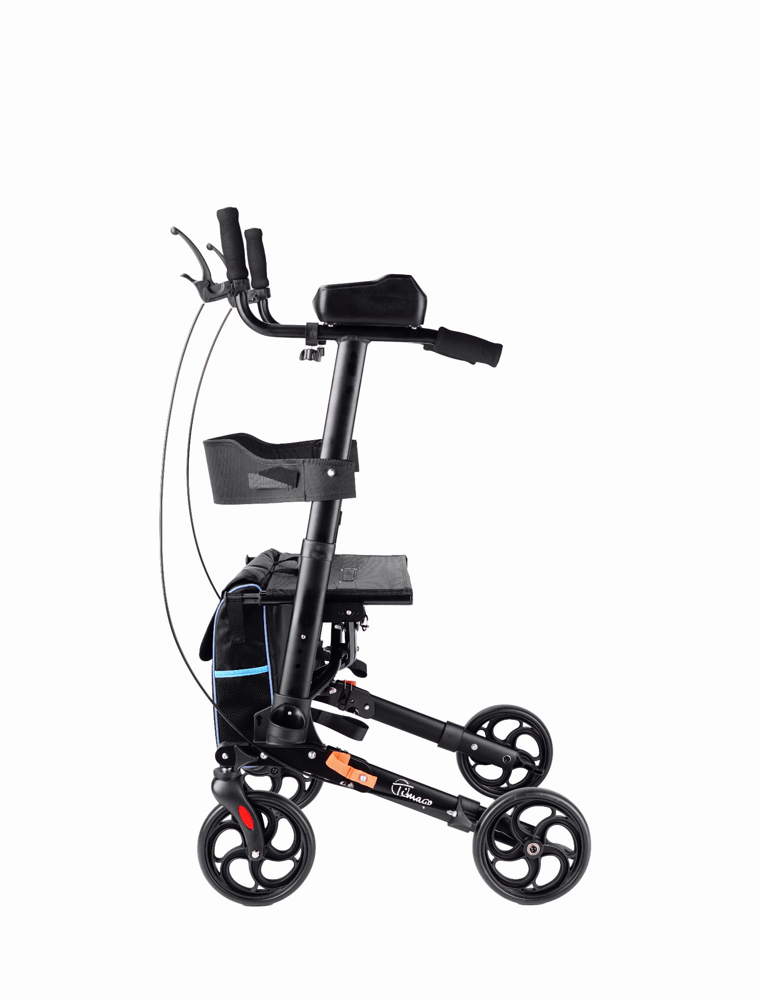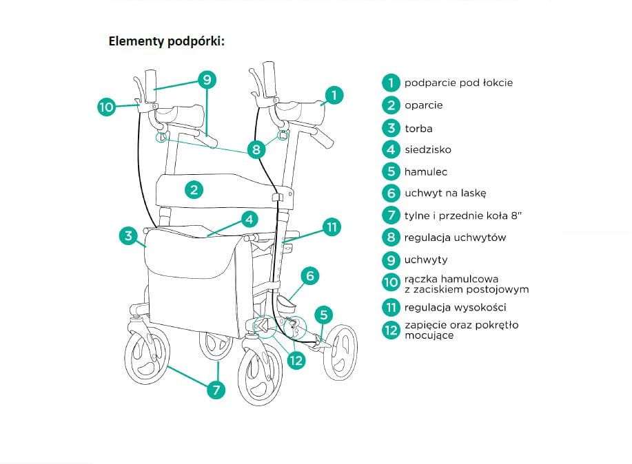 - Posiada regulację wysokości oraz długości uchwytów, podparcie pod łokcie oraz pełne koła o średnicy 8’’.
