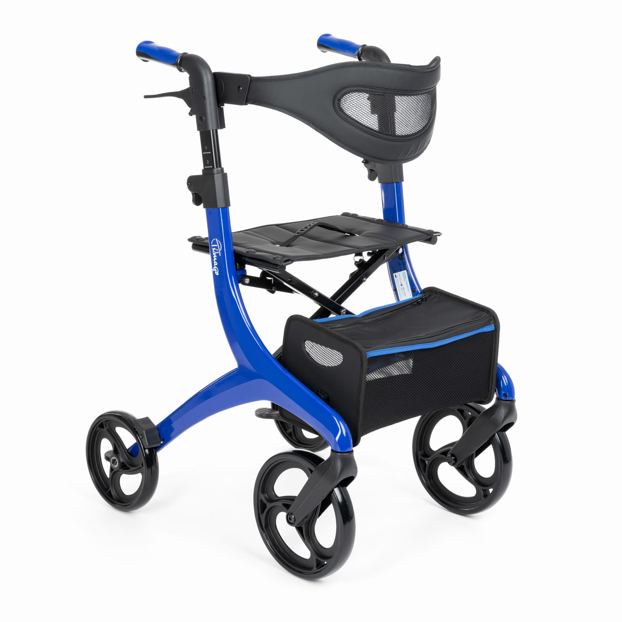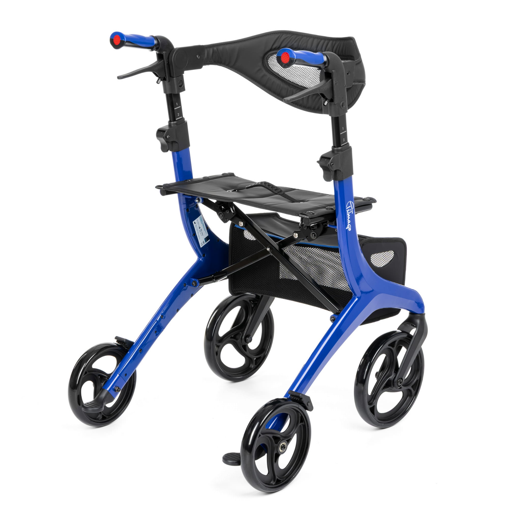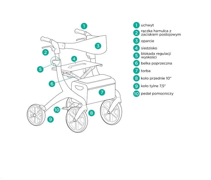 Posiada pełne przednie koła o średnicy 10’’ oraz tylne o średnicy 7,5”, regulowane na wysokość rączki zakończone anatomicznymi uchwytami, tylne hamulce z zaciskiem postojowym, siedzisko z oparciem oraz pojemną torbę.