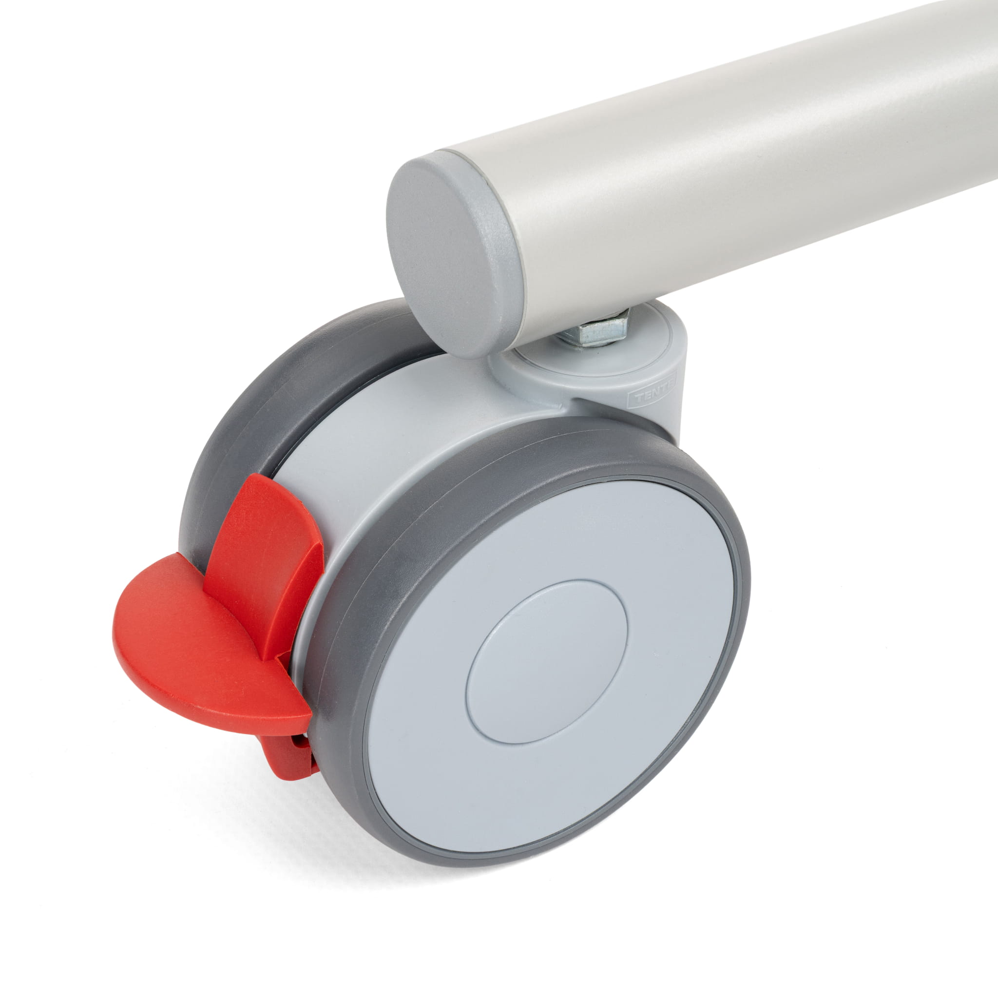 Wykonana jest ze stalowej lakierowanej ramy, została wyposażona w gumowe uchwyty,tapicerowana podparcie pod łokcie z możliwością płynnej regulacji wysokości oraz obrotowe koła z przednimi hamulcami