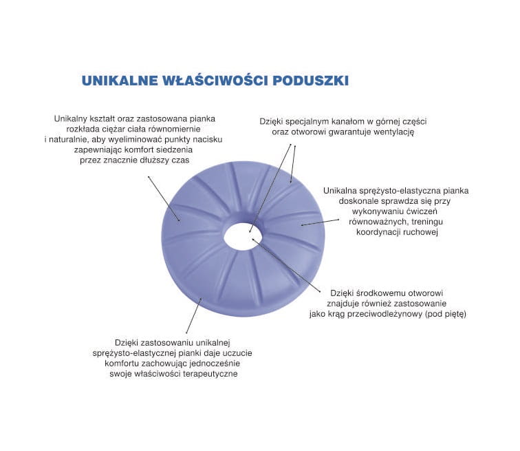 Odciąża odcinek lędźwiowo-krzyżowy kręgosłupa podczas siedzenia i wymusza siedzenie w prawidłowej pozycji, stymuluje mikro-ruchy krążków międzykręgowych.