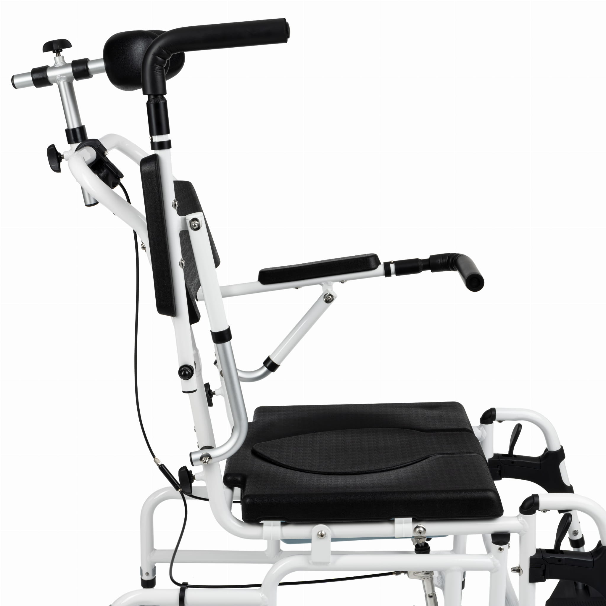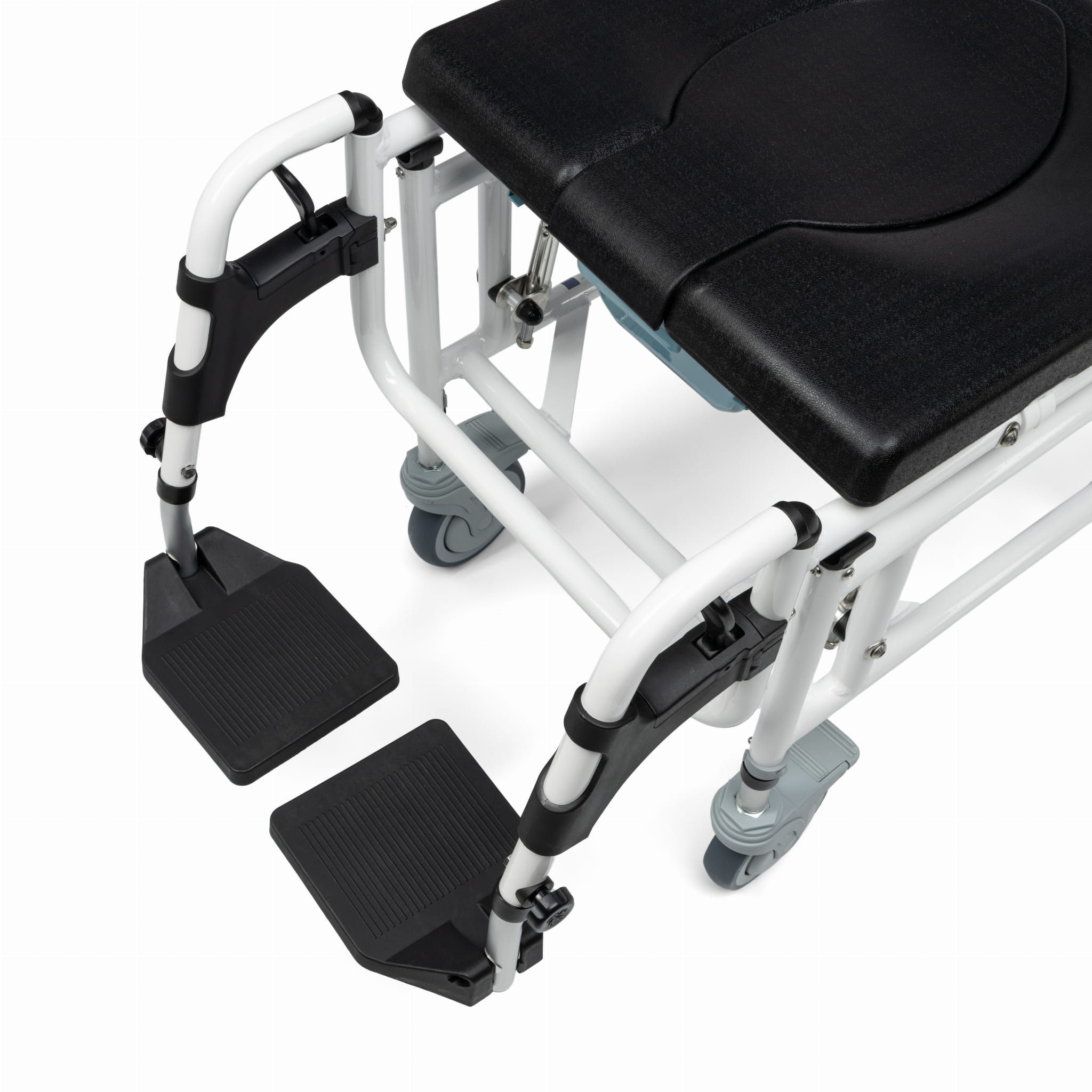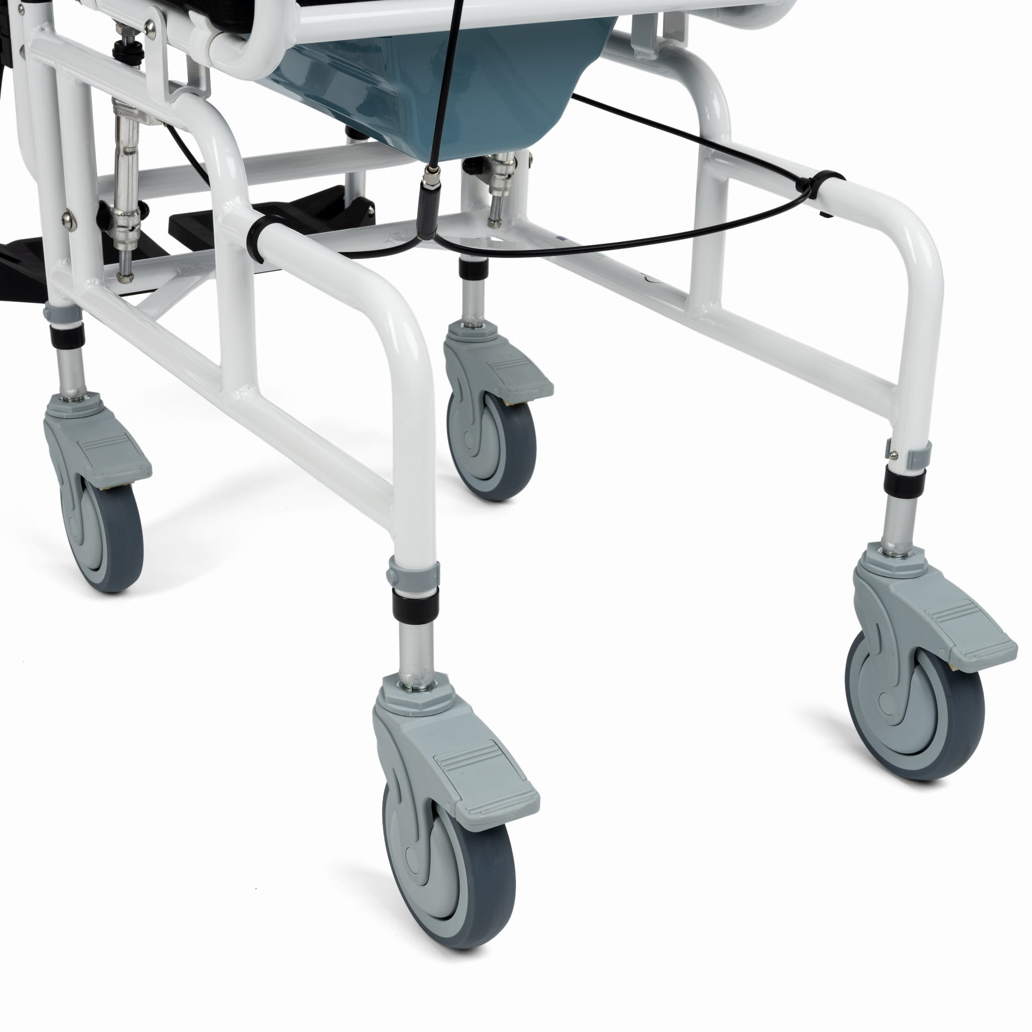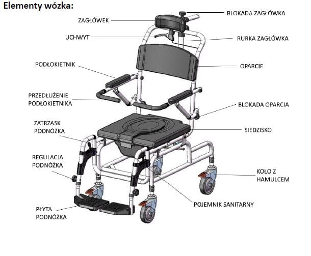 - Wyposażony w siedzisko z klinem wykonane z PU, zagłówek, cztery obrotowe koła 5” z hamulcami, uchylne podnóżki i pojemnik sanitarny.