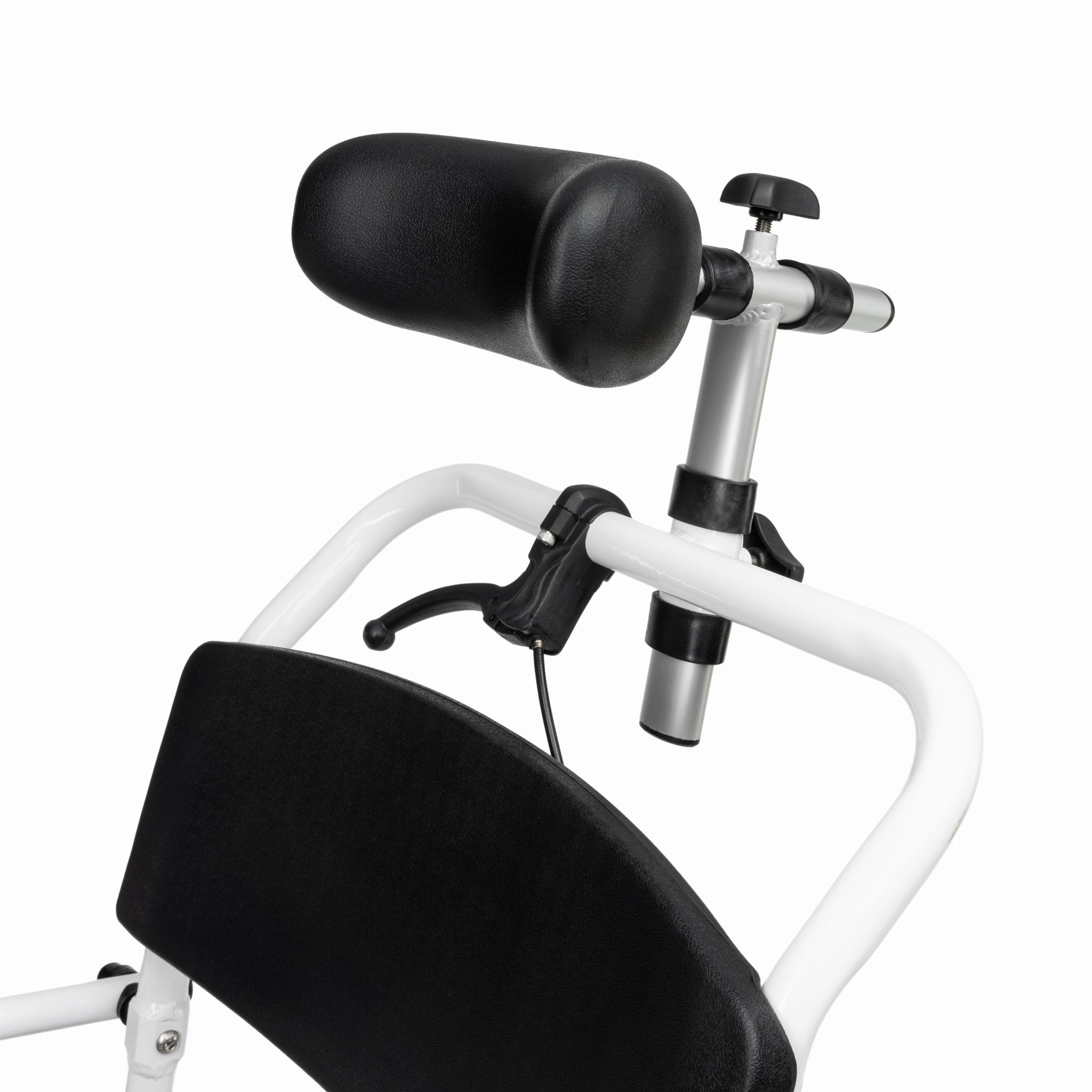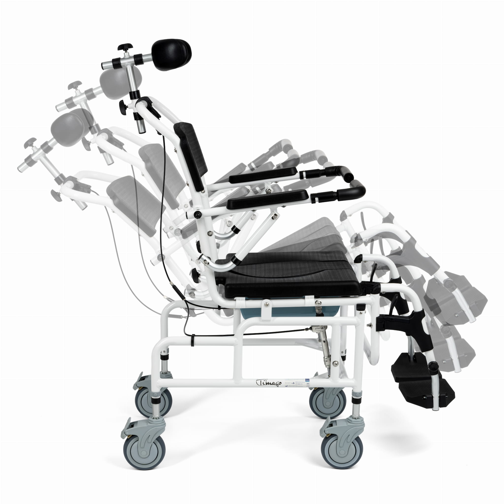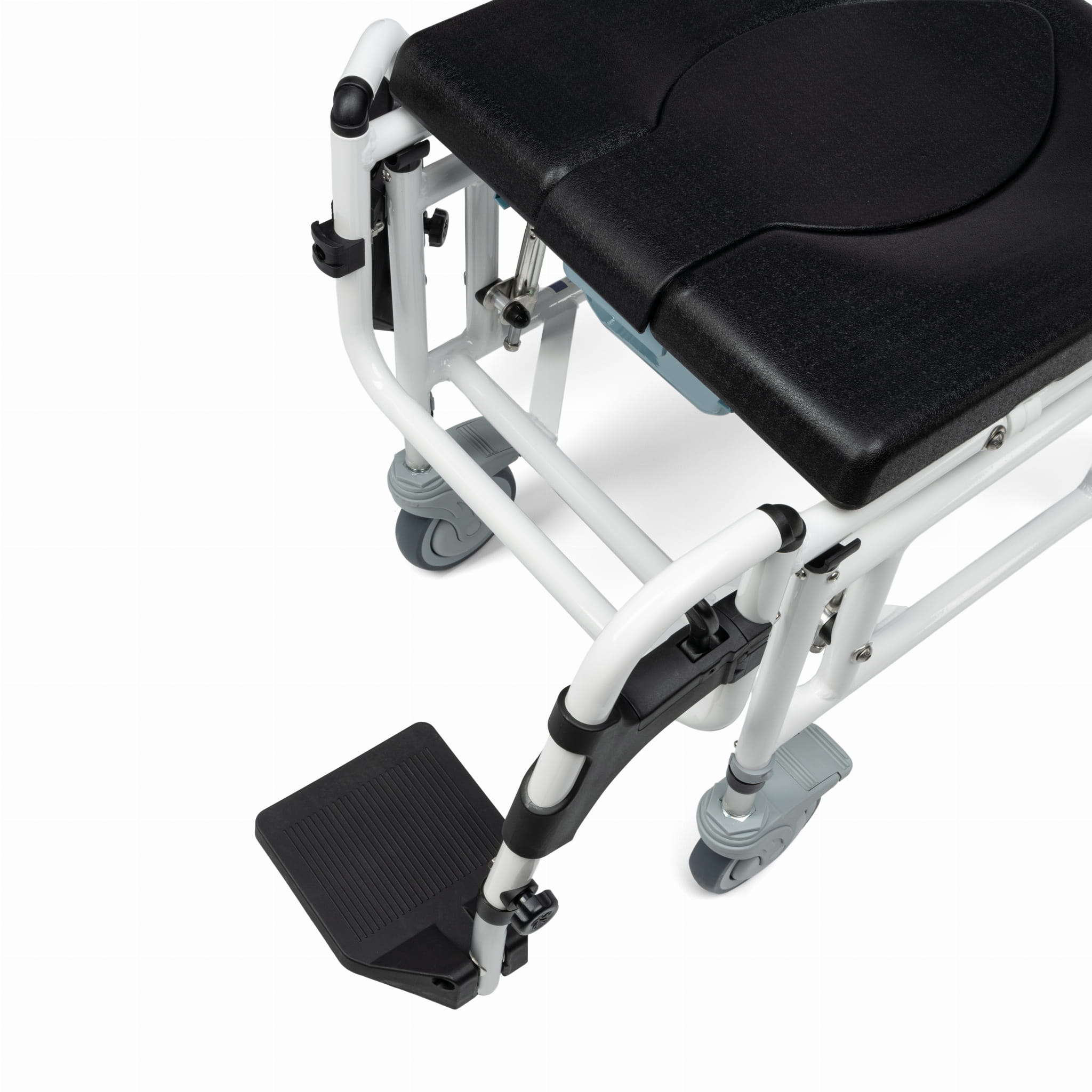 - Wyposażony w siedzisko z klinem wykonane z PU, zagłówek, cztery obrotowe koła 5” z hamulcami, uchylne podnóżki i pojemnik sanitarny.