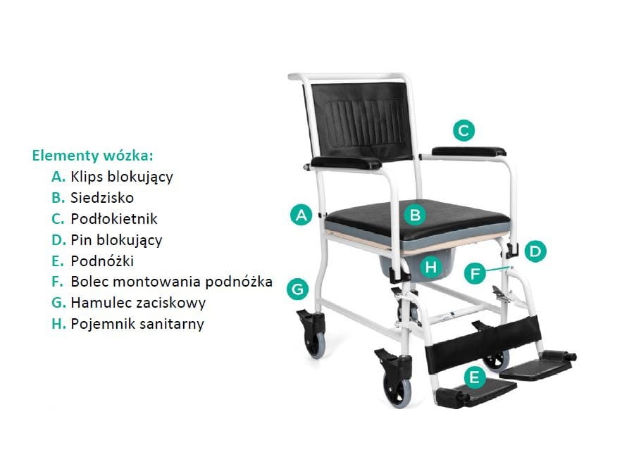 Wózek pełni funkcję transportowo-toaletową dzięki wyposażeniu w pojemnik sanitarny pod siedziskiem i cztery obrotowe koła można nim najeżdżać na sedes.
