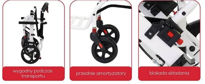 - Blokada zabezpieczająca przed niechcianym złożeniem ramy: Dodatkowa blokada zwiększa bezpieczeństwo użytkowania, zapobiegając przypadkowemu złożeniu wózka.
