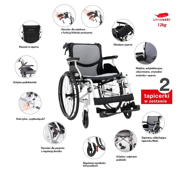 Dzięki wyposażeniu i bardzo solidnemu standardowi wykonania, wózek będzie niezwykle praktyczny i pomocny w życiu codziennym osoby niepełnosprawnej lub osoby mającej problem z narządem ruchu.